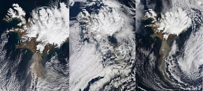NASA satellites captured images of the ash plume (brown) from the Eyjafjallajökull volcano from April 17-19 (left to right). The plume was obscured by high clouds on April 18. Credit: NASA's MODIS Rapid Response Team