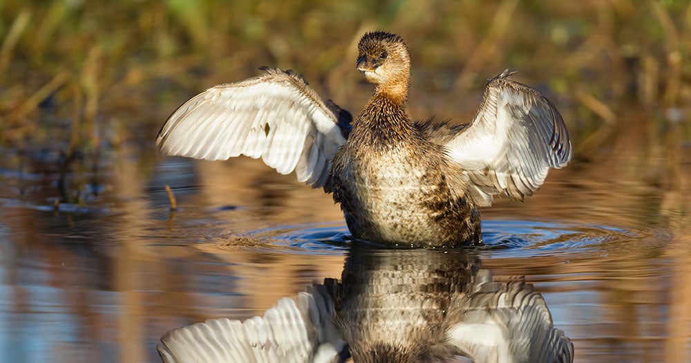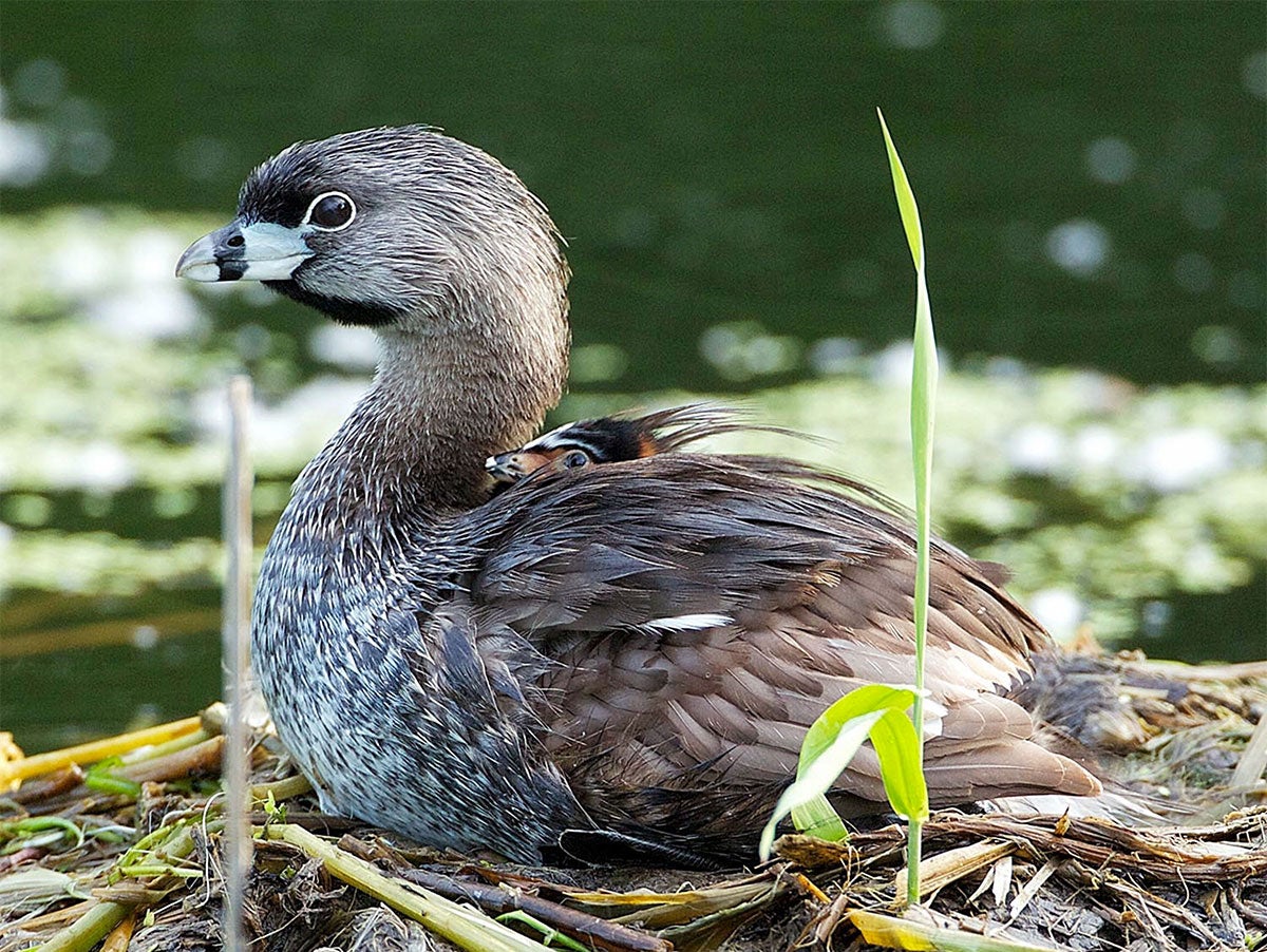The most widespread grebe in the New World, and the most familiar in most temperate parts of North America. Far less sociable than most grebes, almost never in flocks, sometimes found singly on small marshy ponds. When disturbed or suspicious, it may sink slowly until only head is above water. Rarely seen in flight. Often secretive in the breeding season, hiding in marsh, making bizarre whinnying, gobbling, cooing noises by day or night.
