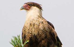 Related to the typical falcons, but very different in shape and habits. The Crested Caracara is a strikingly patterned, broad-winged opportunist that often feeds on carrion. Aggressive, it may chase vultures away from road kills. Widespread in the American tropics, it occurs only near the Mexican border and in Florida. 'Caracara' comes from an Indigenous South American name that mimics the bird’s call.