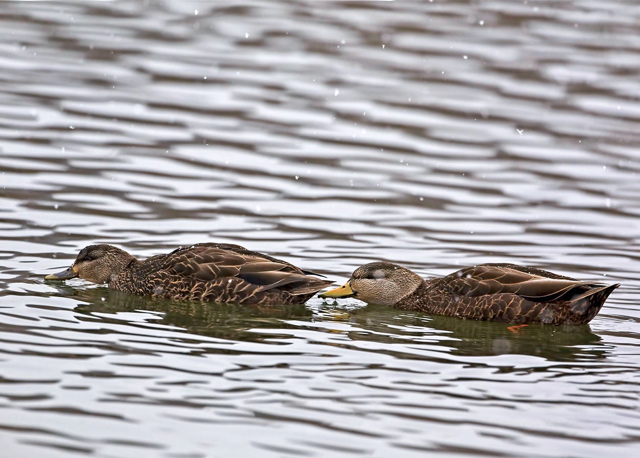 A close relative of the Mallard, the Black Duck is better adapted to wooded country. With the clearing of forest, it has steadily lost ground to spreading populations of Mallards. In its stronghold along the Atlantic Coast it is a hardy bird, wintering farther north than most dabbling ducks. It is among the few dabblers to prosper in tidewater areas; pairs and small parties of Black Ducks are often seen flying over the salt marsh, their white wing linings flashing in bright contrast to their dark bodies.
