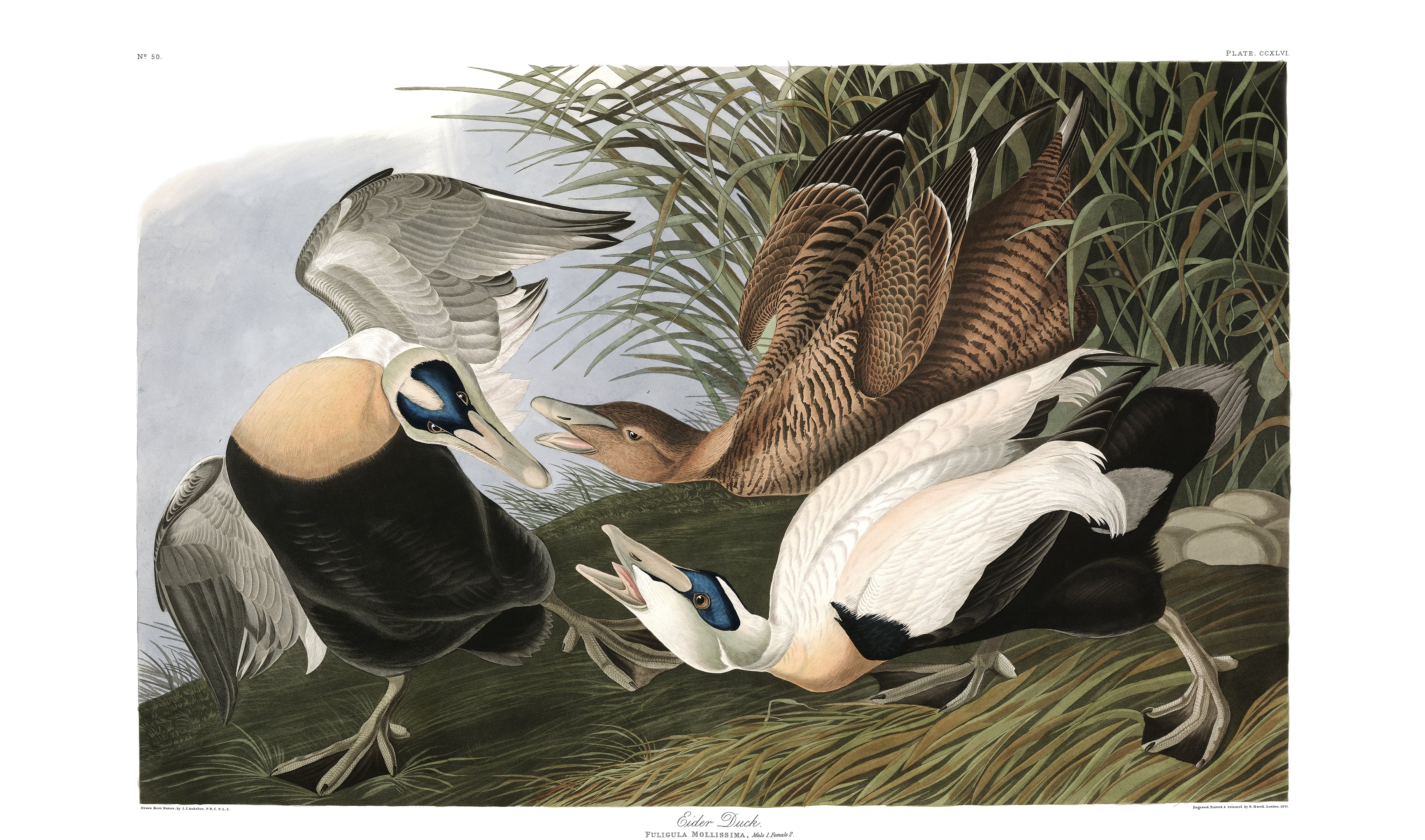 A big, lethargic, heavy-bodied duck of northern coastlines. Often seen floating offshore in flocks of up to several thousand birds. Sociable in breeding season also, and often nests in colonies. Eider down, famous for its insulating qualities, is used in large amounts in the nest lining of these ducks, helping to keep the eggs warm in frigid northern climates. In some places, such as Iceland, the down is harvested commercially at coastal 'eider farms,' where the wild birds are encouraged to nest in sheltered nooks built for them.