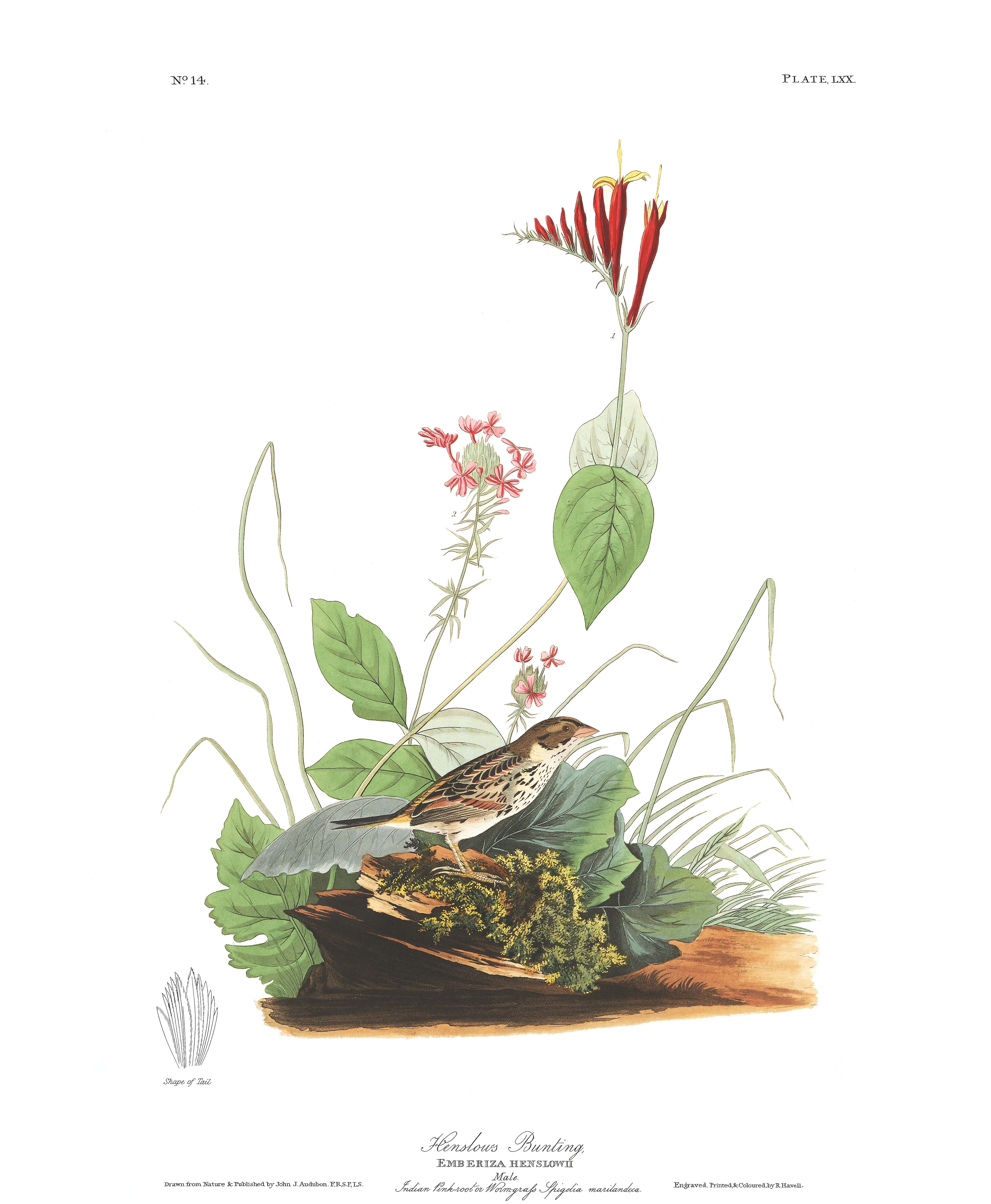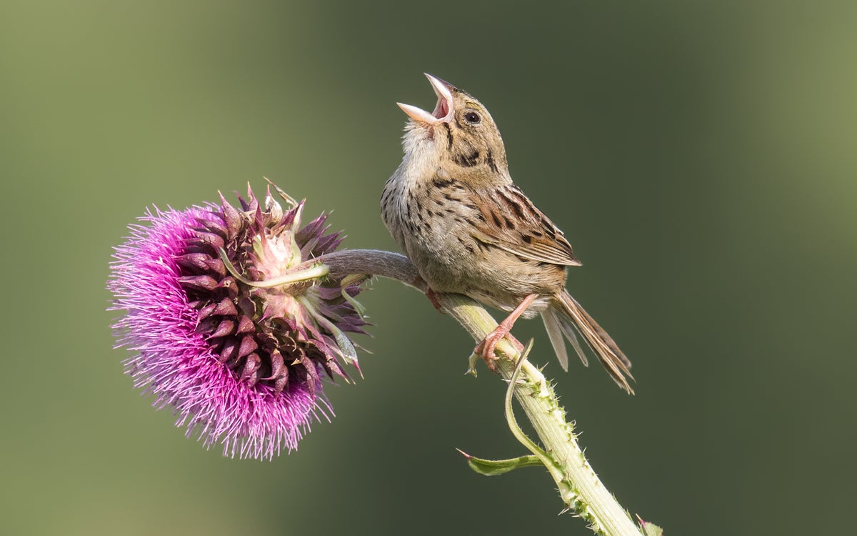 In weedy eastern fields in summer, this little sparrow climbs to the top of a weed stalk, throws its head back, and delivers one of the least impressive of all bird songs, a short tsilick. When not singing it becomes extremely hard to observe, hiding in dense grass. If flushed, it flies away low for a short distance before dropping into the weeds. Despite its lack of vocal prowess, Henslow's Sparrow is a beautifully marked bird if seen well. Local populations vary from year to year; overall, the species is becoming quite scarce over most of its range.