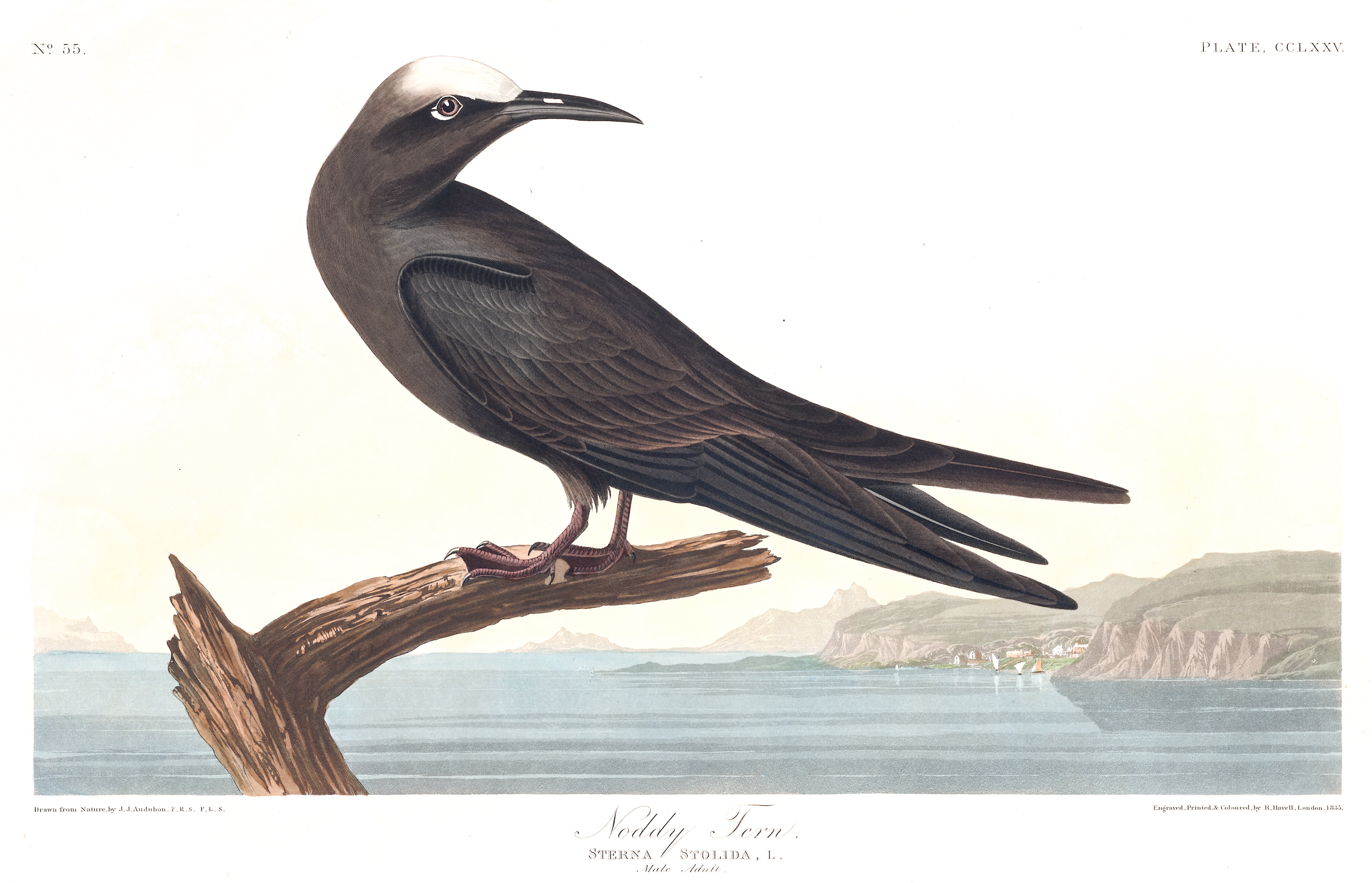 Most terns are white with dark caps, and have forked tails. The Brown Noddy, like an anti-tern, is dark with a white cap, and has a wedge-shaped tail. At sea it flies low, with deep wingbeats; when perched, it has a solemn and lethargic look. Widespread in tropical oceans, including around Hawaii. Birders know this species mostly from its colony at the Dry Tortugas, Florida, where it nests alongside the much noisier and more numerous Sooty Tern.
