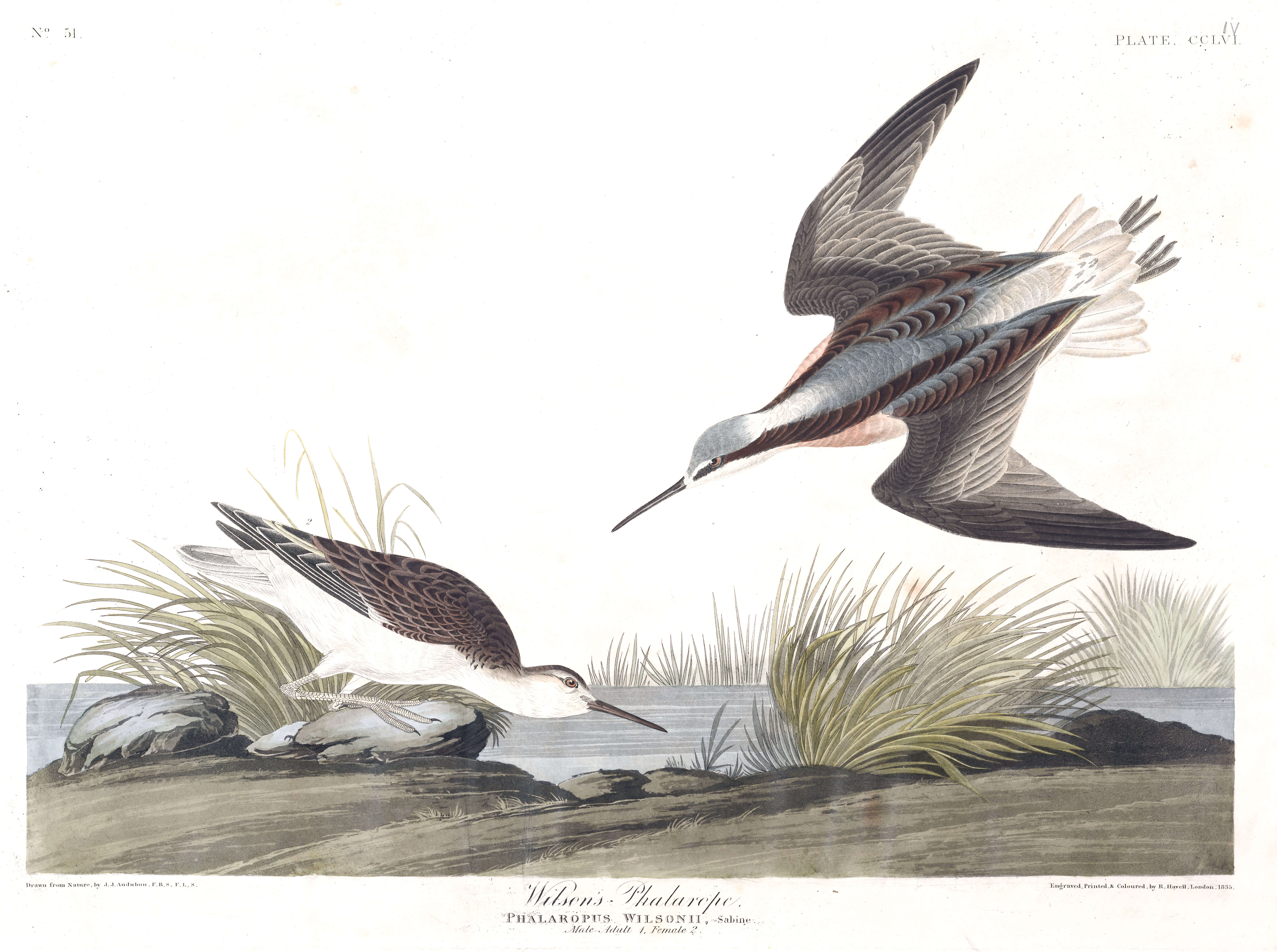 Phalaropes reverse the usual sex roles in birds: Females are larger and more colorful than males; females take the lead in courtship, and males are left to incubate the eggs and care for the young. The Red Phalarope nests in the high Arctic, and winters in flocks on southern oceans. It is rarely seen inland in most parts of North America.