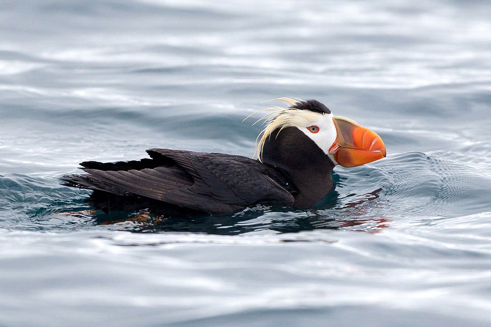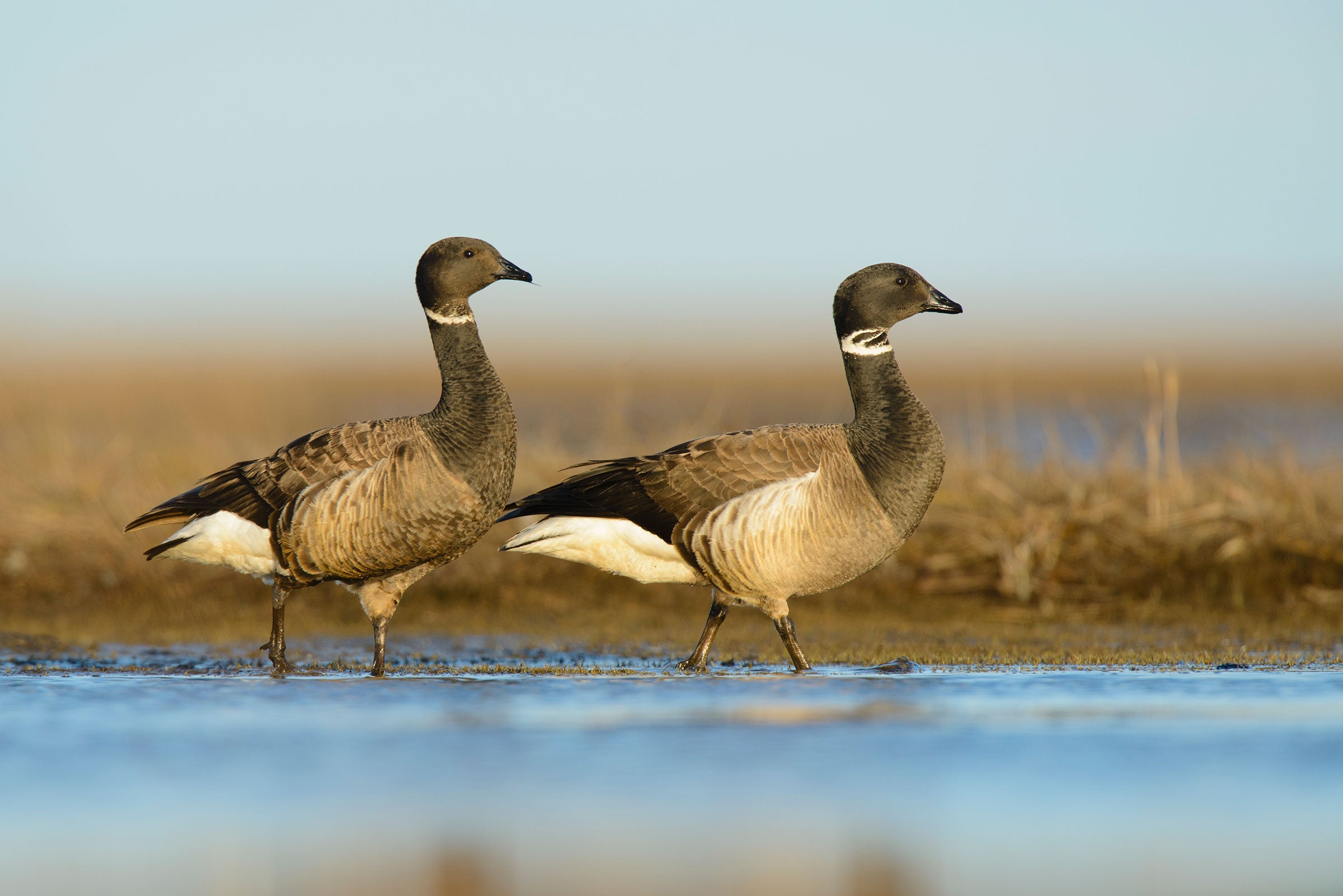 The smallest of the eiders. More agile than the others in flight, and less clumsy on land; floats buoyantly on the water, often with its tail cocked up. Its distribution in the Arctic and Subarctic is centered on the Bering Sea. Sociable at most times of year. Flies in tightly packed flocks, and often feeds in compact groups as well. When foraging on the sea, all the birds in a flock may dive at the same time. Lone Steller's will sometimes associate with flocks of Harlequin Ducks or other divers.