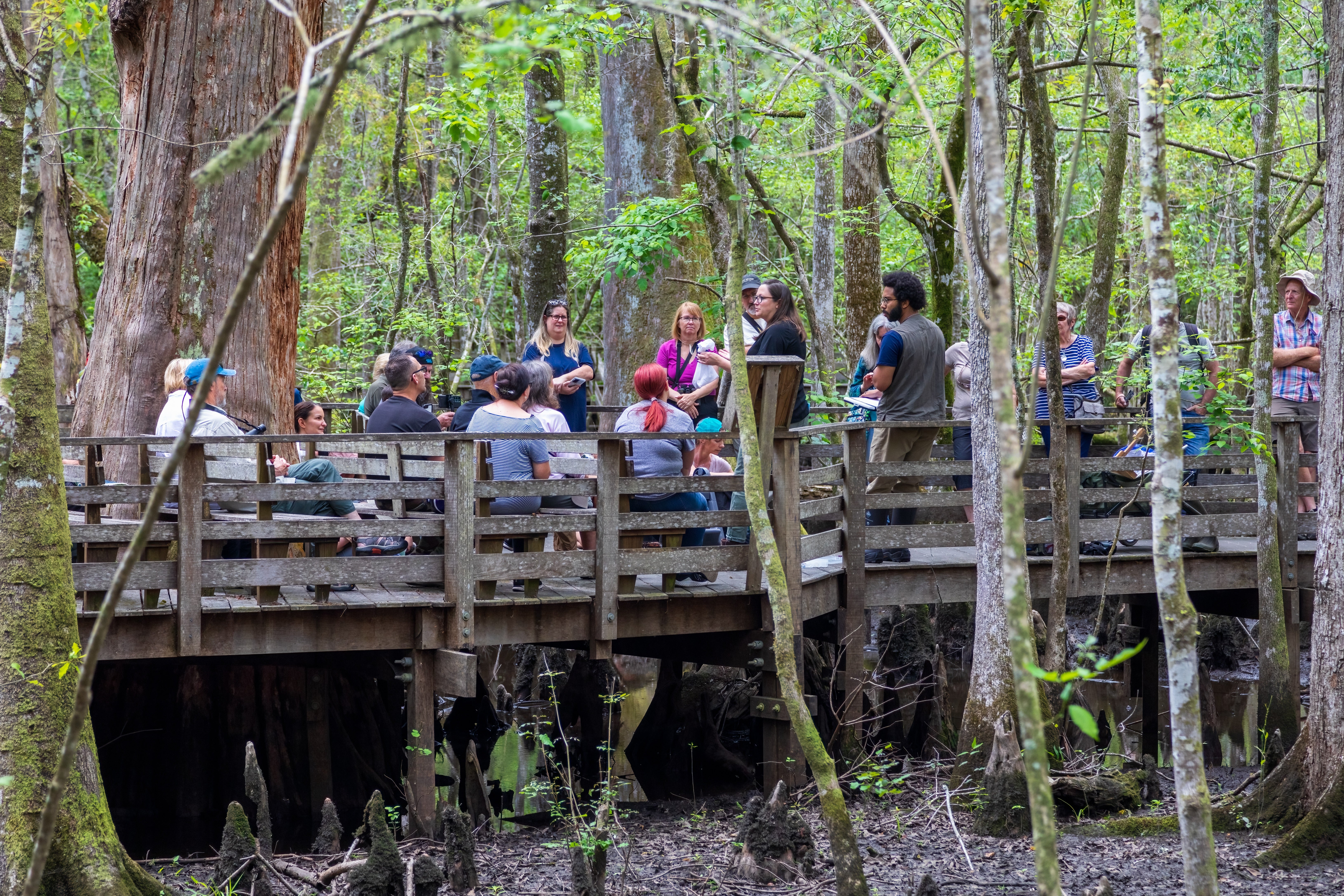 We offer scheduled guided tours available to the public along our 1.75 mile boardwalk on select days. All are welcome! This trail curves between giant 1,000 year old cypress in one of two remaining virgin forests in the state of South Carolina, and keeps you high and dry while allowing you to observe the numerous wild animals that thrive in this nature sanctuary. An Audubon naturalist will go along with you and provide general knowledge about the swamp, which can include anything from ecology and hydrology to more nuanced details about our native flora and fauna. Our boardwalk is ADA compliant and this program is best suited guests 6 years old and up.