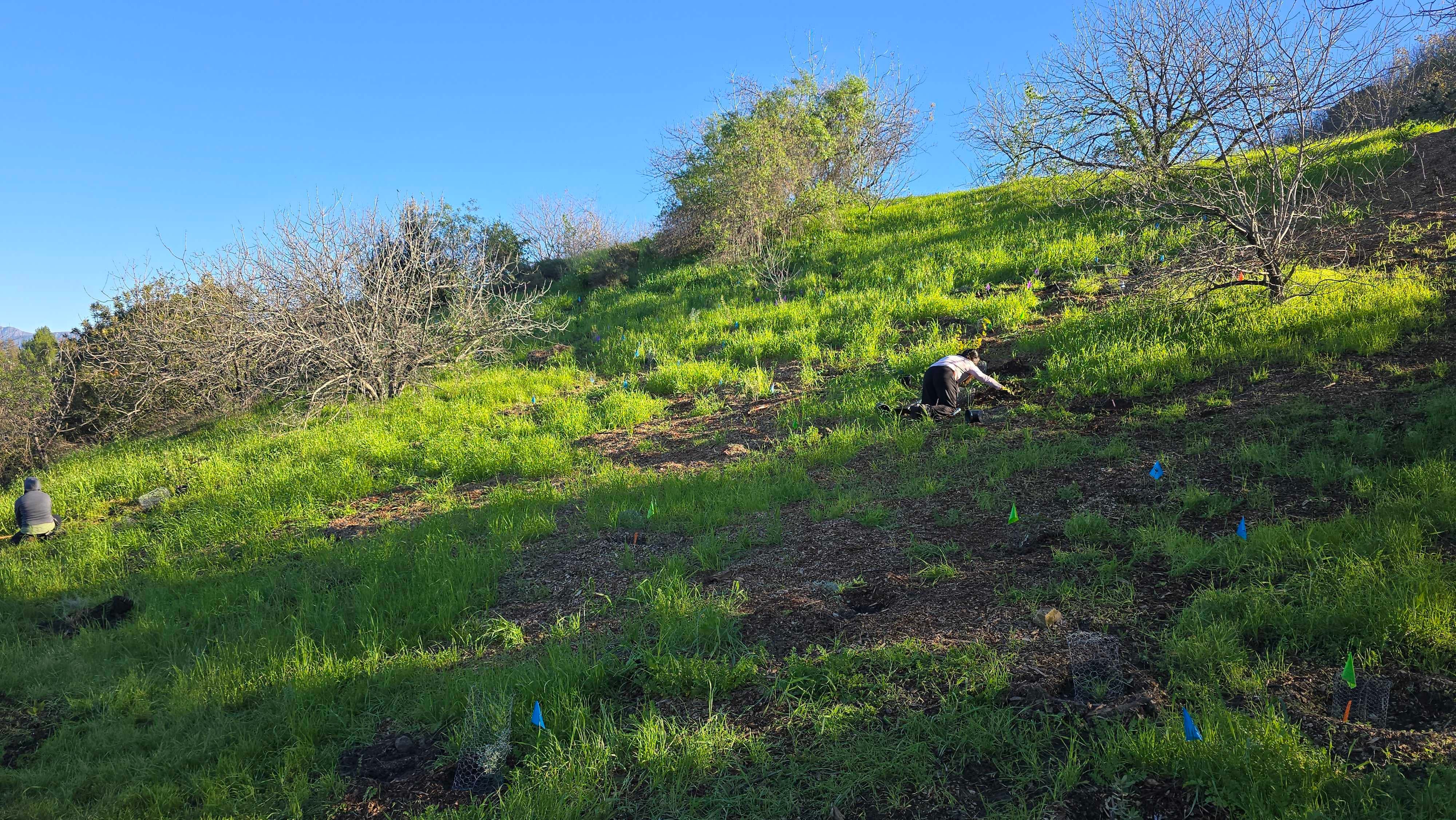 Adjacent to that site is a small grove of Coast Live Oak trees which creates a distinct microclimate that differs greatly from the exposed slope. There, the air is cooler, the soil is more moist, and a thick layer of oak duff covers the ground. In that area, we are planting plants typical to the oak understory, such as Heartleaf Keckiella, Creeping Snowberry, and Hummingbird Sage. Between these two zones, we are planting plants that successfully straddle the two zones, such as Toyon and Blue Elderberry.