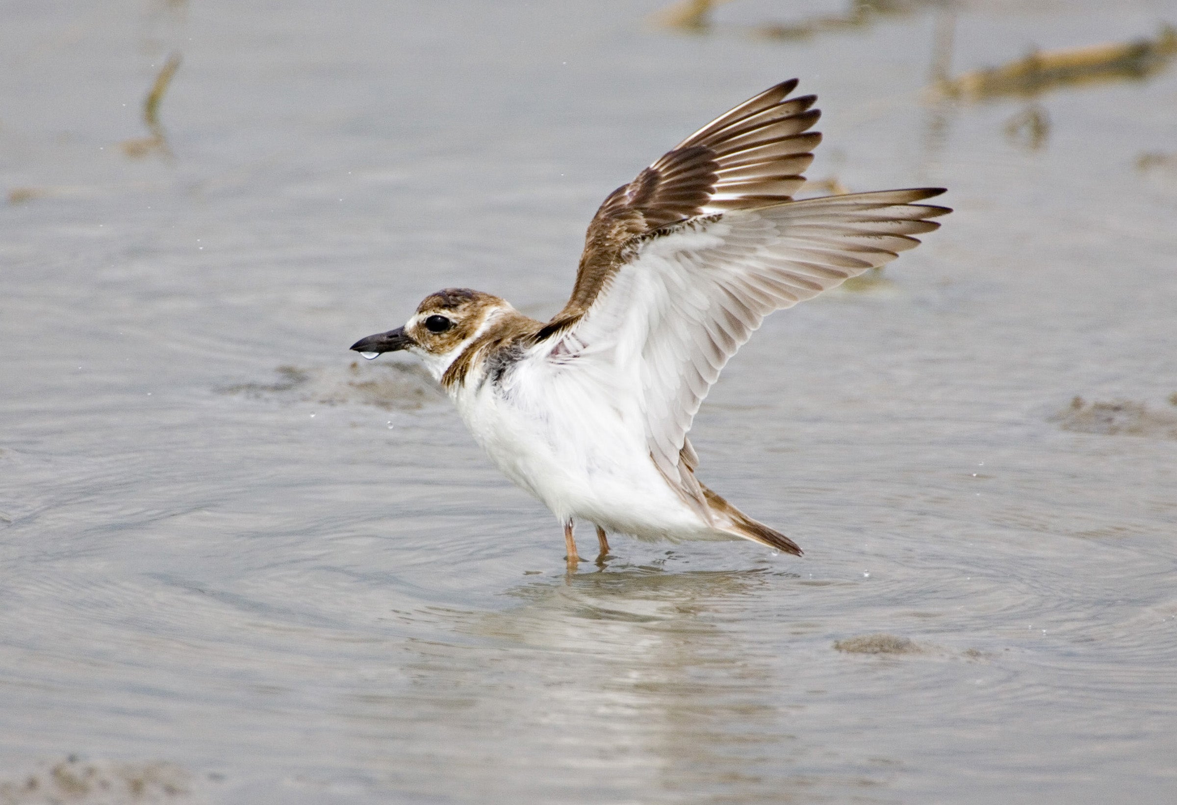 This medium-sized plover has a dark neck ring, grayish-brown upper parts, a white underside, and pinkish-gray legs. A male in breeding plumage has a black band across its white breast. Breeding females are more muted in color. Nonbreeding adults of both sexes have a brown breast band.