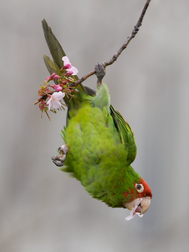 Ben Knoot and his dad were returning from a successful mission to spot a white-throated sparrow when they noticed a crowd of people around a flowering tree in a San Francisco park. A flock of red-masked and mitred parakeets—which freely roam the city—were putting on a show. Despite the commotion, Knoot, 17, snagged a singular shot. “I got a treat when I saw in the photo that it was hanging by one foot.”