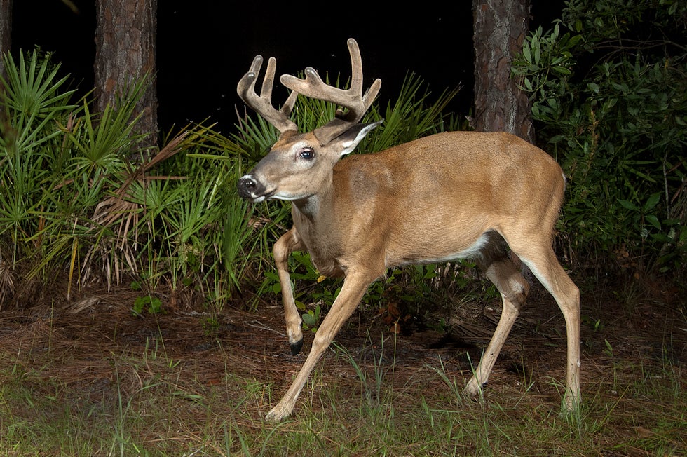 A white-tailed deer displays late spring velvet on its antlers as it's caught by a trail camera. Habitat for game species is one incentive to manage wilderness on private lands, offering benefits to non-game species as well.