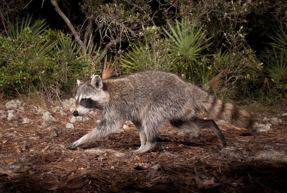 A raccoon moves through the night along the Lake Wales Ridge on the Archbold Biological Station, located a few miles north of the camera at the Hendrie Ranch. Captured with a motion-sensitive camera at the Station.