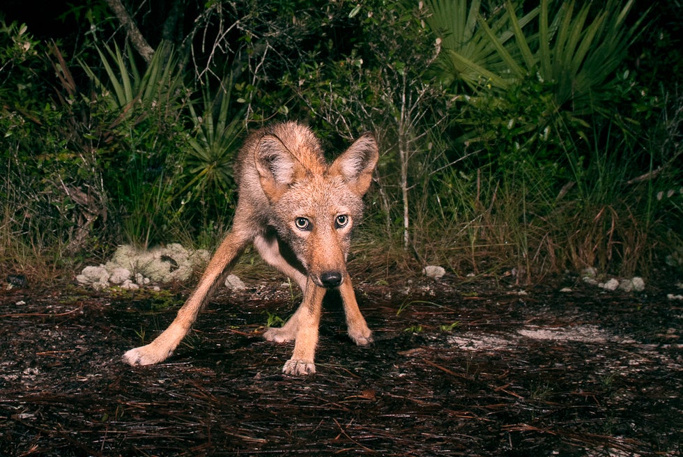 A juvenile coyote stares into the trail camera at Archbold Biological Station.