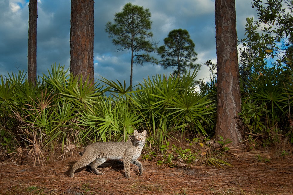 A bobcat moves through the twilight is caught by a trail camera. Bobcats are relatively abundant on Florida cattle ranches.