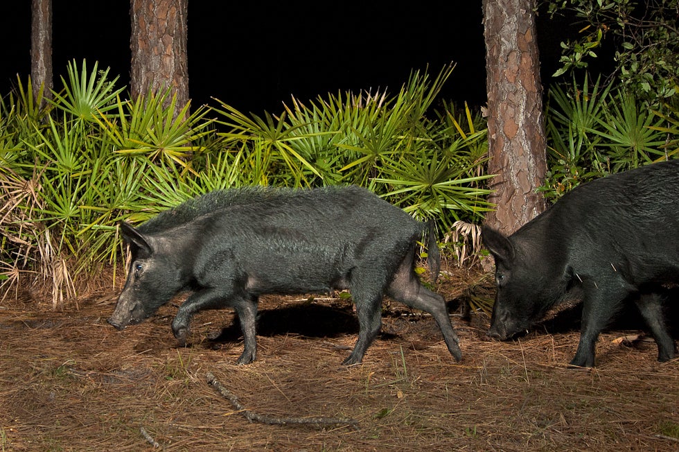 Wild hogs, often called razorbacks from the shape of the hair on the necks of the boars, are common throughout Florida's agricultural and natural lands. Spanish explorers introduced them to the state 500 years ago. Because of their prolific breeding and destructive foraging in the dirt, hogs are harmful to Florida ecosystems. Land managers expend great energy hunting and trapping them to mitigate damage. These were caught by a motion-sensitive camera.