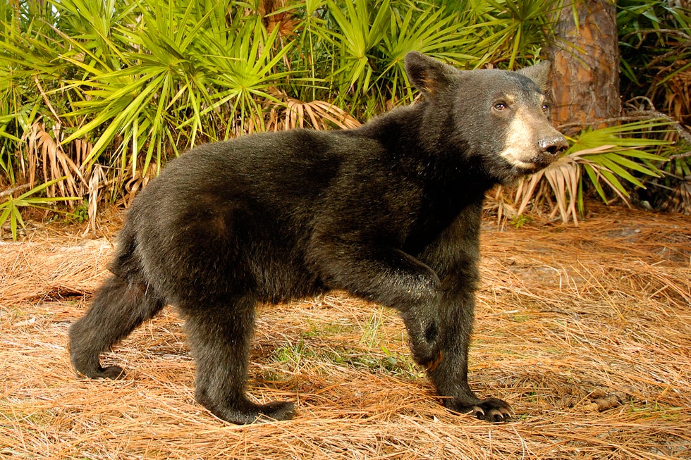 A bear cub triggers a motion-sensitive camera as it crosses in front of saw palmettos whose berries are important to its diet. Highlands County, Florida ranches provide excellent habitat for a population of black bears which survive there almost entirely on private land, a component of the Florida Wildlife Corridor opportunity area.