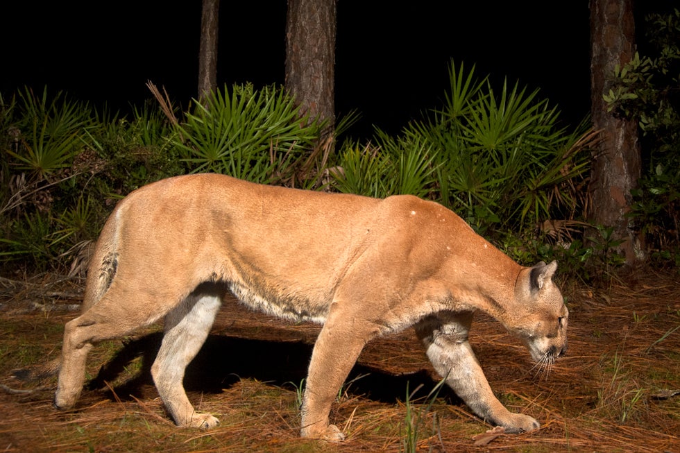 A mature male panther, estimated to be four years old, crosses the Hendrie Ranch, located south of Lake Placid in Highlands County, along the eastern slope of the Lake Wales Ridge. With high sand scrub, oak hammocks, pine flatwoods, rare cutthroat grass seepage slopes, and one of the largest remaining bay forests in the state, the Hendrie family’s stewardship protects some of the highest quality natural habitat in Florida. Captured with a motion-sensitive camera at the Hendrie Ranch.