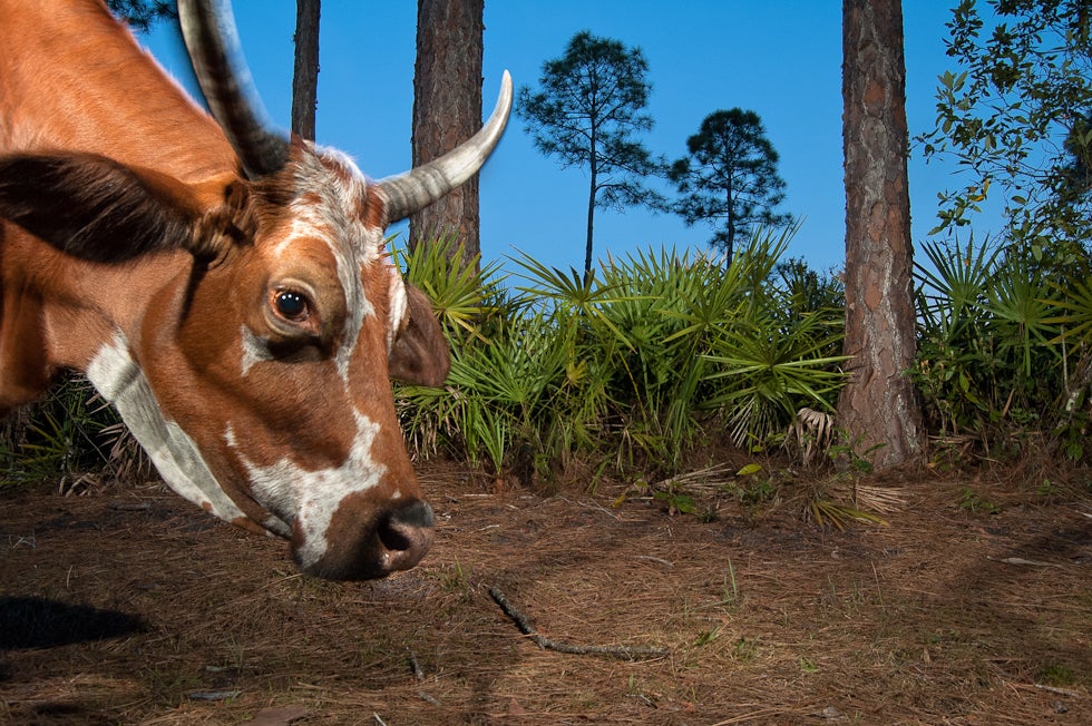 The Hendrie Ranch provides a home for commercial cattle as well as wildlife. Some of the best wildlife habitat in the country exists on Florida cattle ranches. Grazing densities average one cow to five acres and are compatible with the native ecosystems. Cattle first arrived in Florida from Spain in 1521, with the first cattle and horses in North America and were living wild in the woods when colonists arrived in the 1800s. The original 'Cracker' cattle still exist; larger English and Asian breeds such as Hereford, Angus, and Brahma are more common. This cow appears, captured with a motion-sensitive camera, appears to be a Braford, which is a cross between Brahma and Hereford.