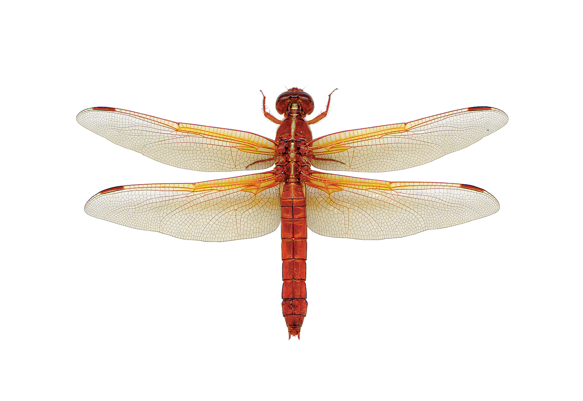 The wings of the female flame skimmer (Libellula saturate) have some orange in them, but it is not as extensive as that of the male.