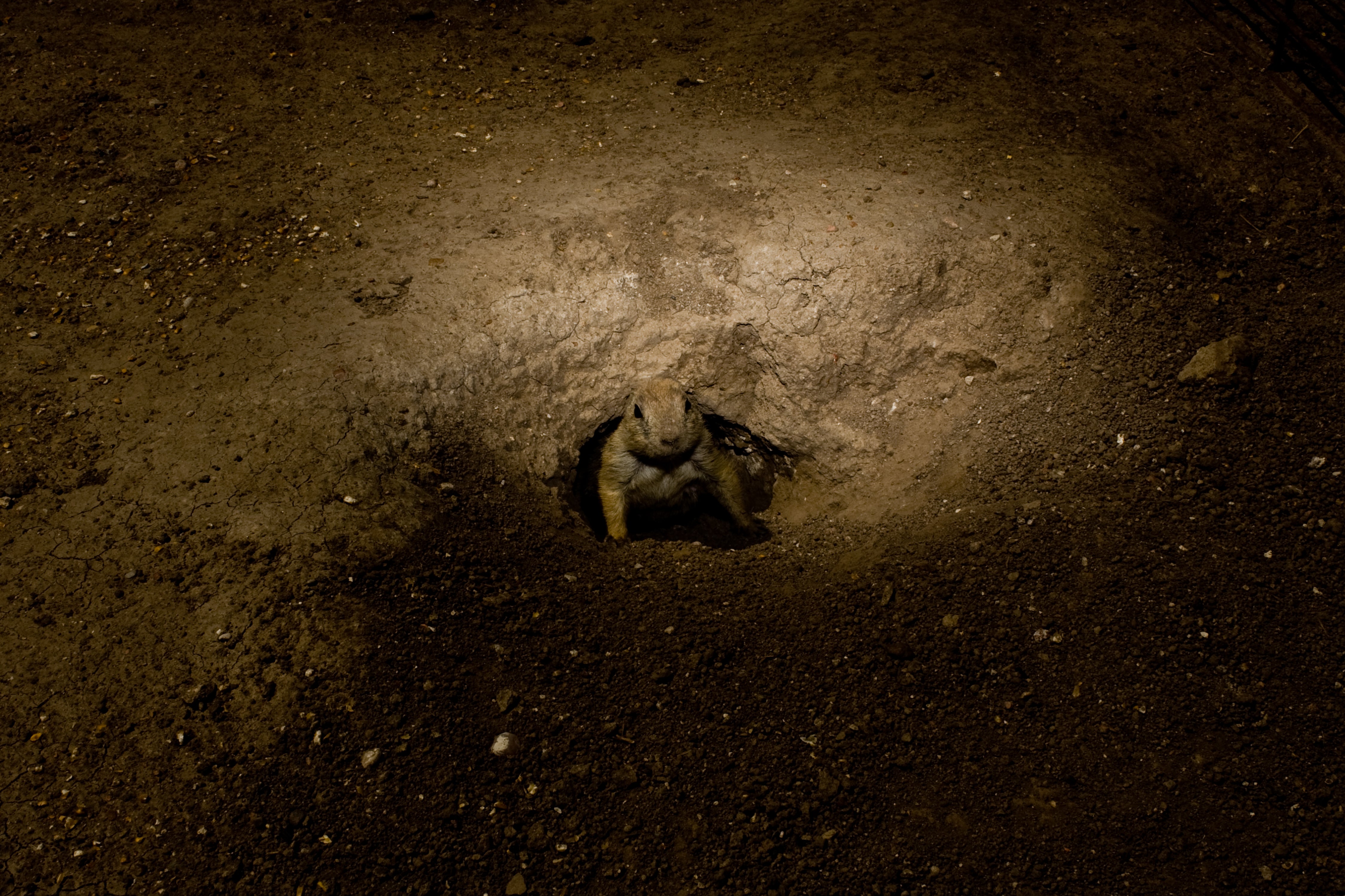 A black-tailed prairie dog peers up from its burrow at Prairie Dog Town, near Oakley, Kansas.