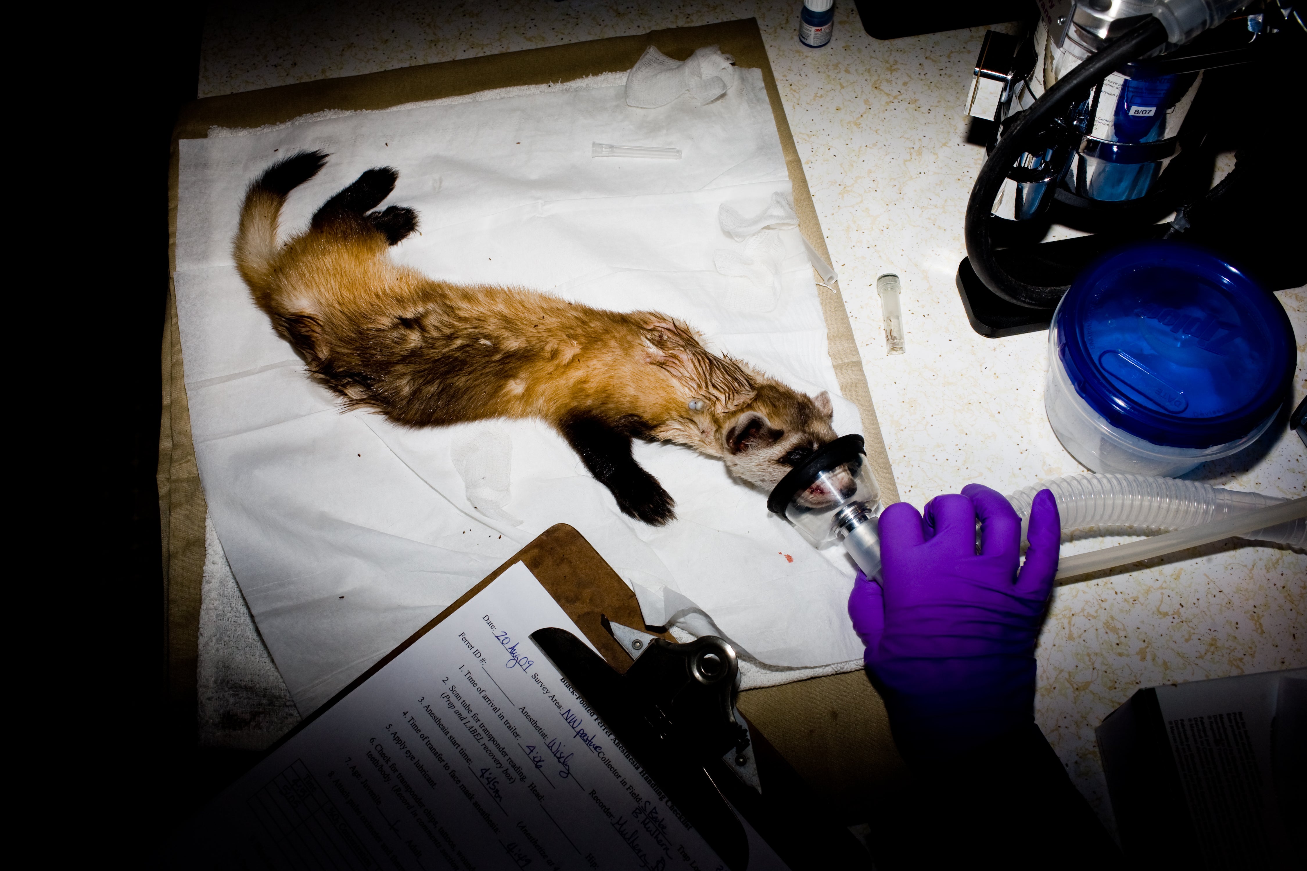 A ferret being vaccinated and tagged by a biologist at the Haverfield ranch in Kansas.