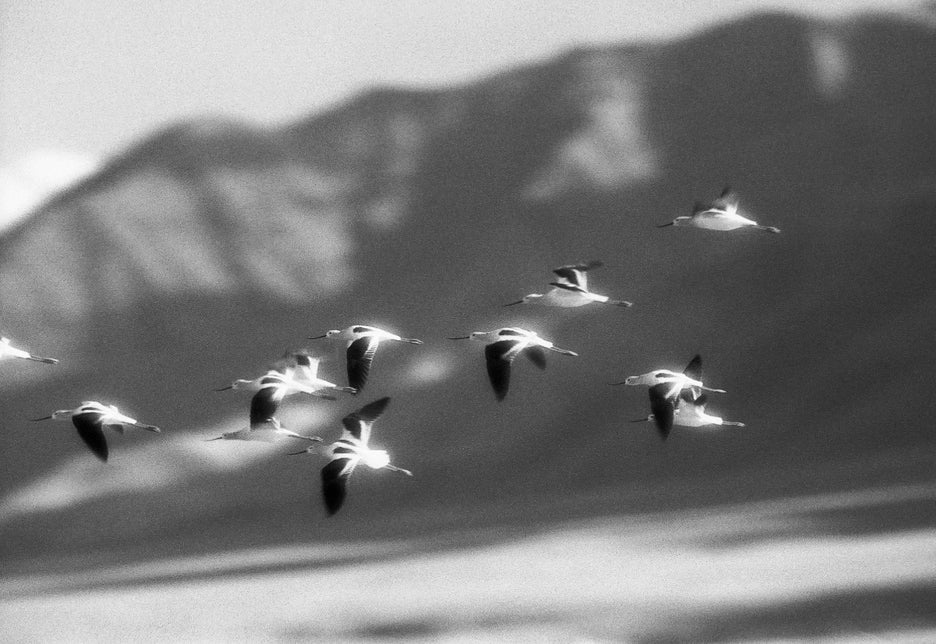 An American avocet and western sandpipers along the shore of Owen's Lake.