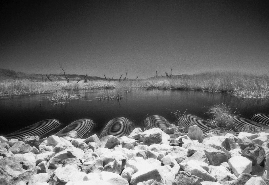 Owens Lake, at the base of the Inyo Mountains, covers nearly 100 square miles. The lakebed is crisscrossed by a grid of driveable dikes that hide hundreds of miles of pipeline.