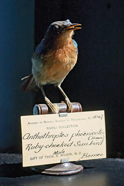 Mounted Ruby-Cheeked Sunbird. Duc de Rivoli collection. Given to the Academy by T.B. Wilson in 1846. ANSP Exhibits Department.