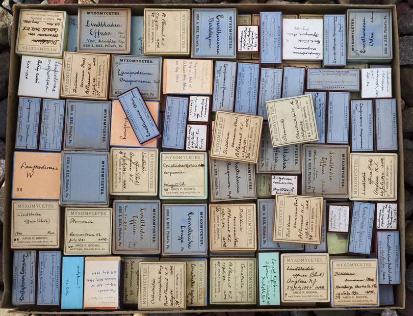 A collection of slime molds (Myxomycetes) assembled by George A. Rex in the late nineteenth century. ANSP Botany Department.
