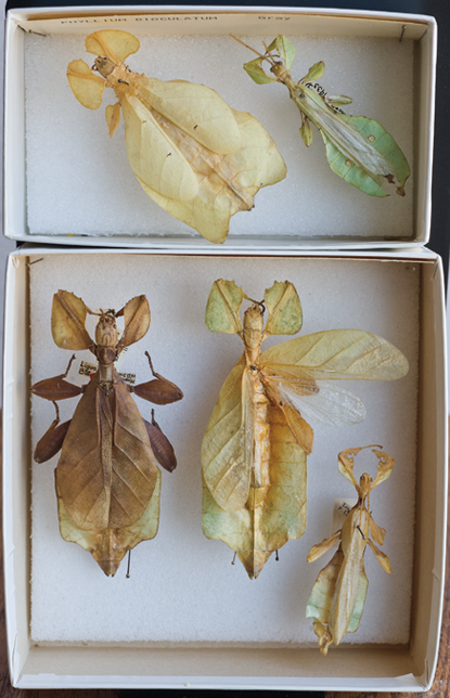 “Leaf insects” (a lineage of tropical walking sticks). These remarkable Phasmida are found in rainforest canopies of tropical Asia. Included in this group are some newly described specimens from the Philippines. The other are from New Guinea and the Seychelles. ANSP Entomology Department.