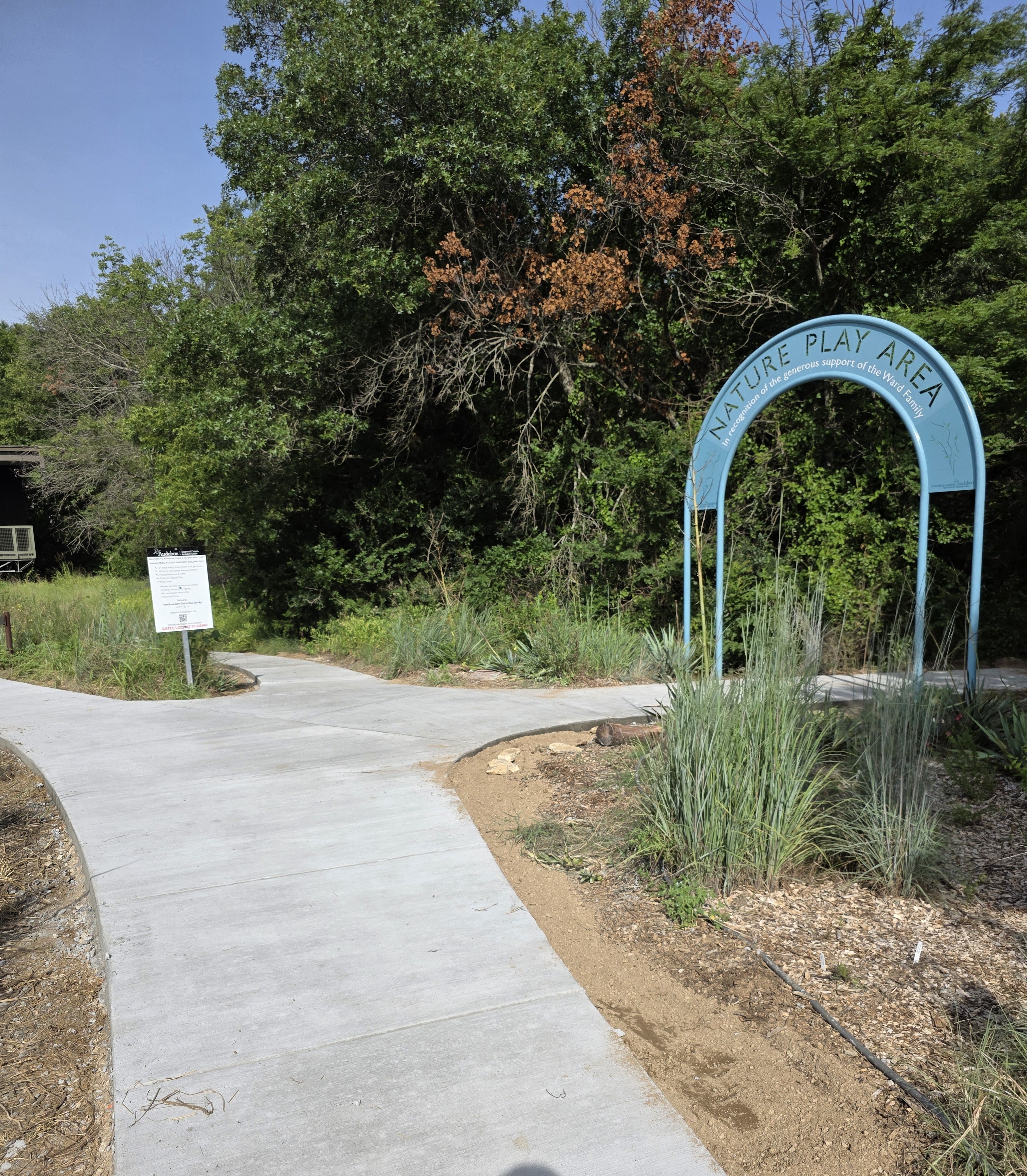 - The 4-foot wide concrete path leads the visitor to three options: entry to the children's Nature Play area, access to the bottom of the basin, and the path leading to the C.E. Doolin Visitor Center building.