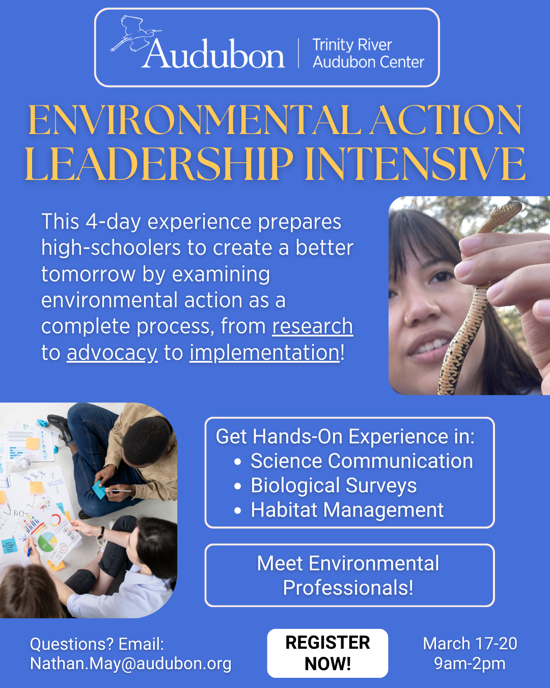 This Spring break, Trinity River Audubon Center is proud to launch its Environmental Action Leadership Intensive. This 4-day program meets 9am-2pm at...