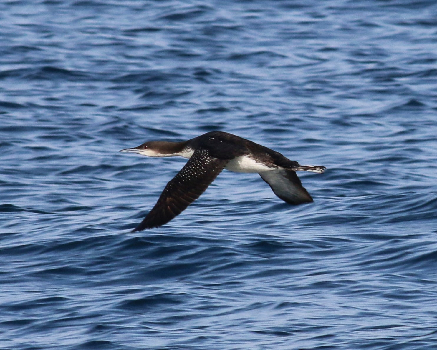 En pocas ocasiones, se los ve tierra adentro en el otoño y casi nunca en primavera. Por lo tanto, las aves pueden realizar vuelos de gran extensión sobre el continente, o hacer un largo viaje a través de Alaska, desde las áreas de invernada en la costa del Pacífico hasta las zonas de reproducción en la zona central del Ártico canadiense. Las aves migratorias que se dirigen al norte a lo largo de la costa del Pacífico pueden viajar en bandadas a varios kilómetros de la costa, normalmente a menos de 18 m sobre el agua; evitan volar en días de viento intenso en contra.