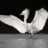 presenta una amplia variedad de comportamientos de alimentación. A menudo es muy activa y corre a través de aguas poco profundas con la cabeza inclinada hacia un costado para luego cambiar su dirección de repente o saltar hacia un costado. También puede quedarse quieta y abrir las alas parcialmente; de este modo, puede atraer cardúmenes de peces pequeños que busquen refugio de manera instintiva bajo la sombra de las alas. En ocasiones, también tiene comportamientos alimentarios más pasivos.