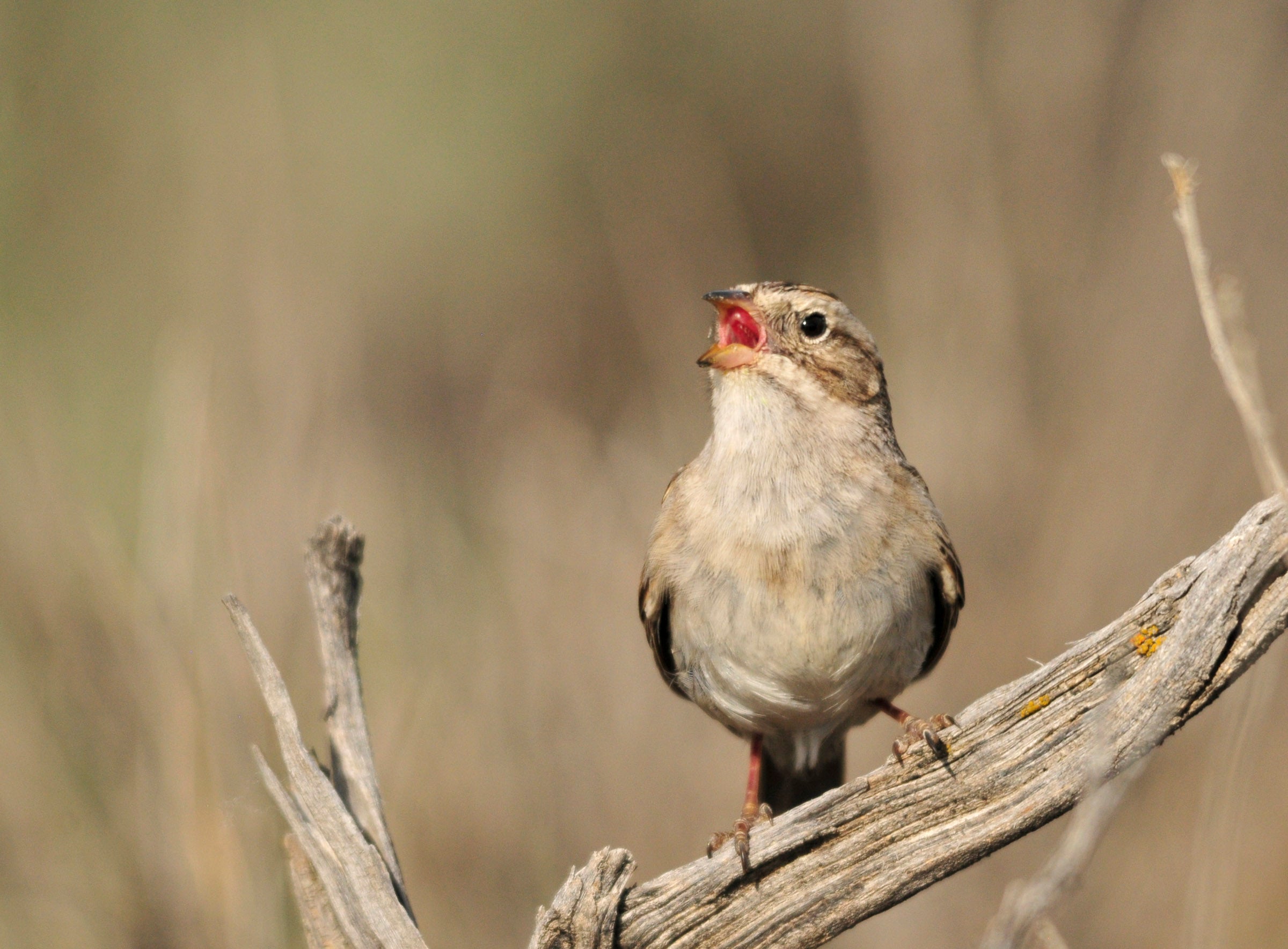 Este pequeño gorrión de plumaje monótono es una de las aves de verano más características de las planicies de artemisa de la Gran Cuenca. Compensa la simplicidad de su plumaje con la notable variedad de su canto. Suele desarrollar su canto por completo en verano, aunque las bandadas de invierno a veces se posan sobre matorrales desérticos y cantan juntas en un coro confuso y desordenado.