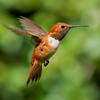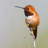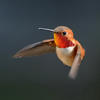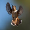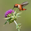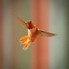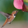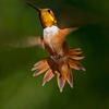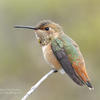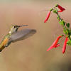 Principalmente néctar e insectos. Liba néctar de las flores y también come insectos pequeños. Frecuenta flores tubulares rojas como el penstemon, la aguileña roja, el pincel indio, la salvia escarlata, la gilia y muchas flores más. También se alimenta de mezclas a base agua y azúcar en comederos para colibríes.
