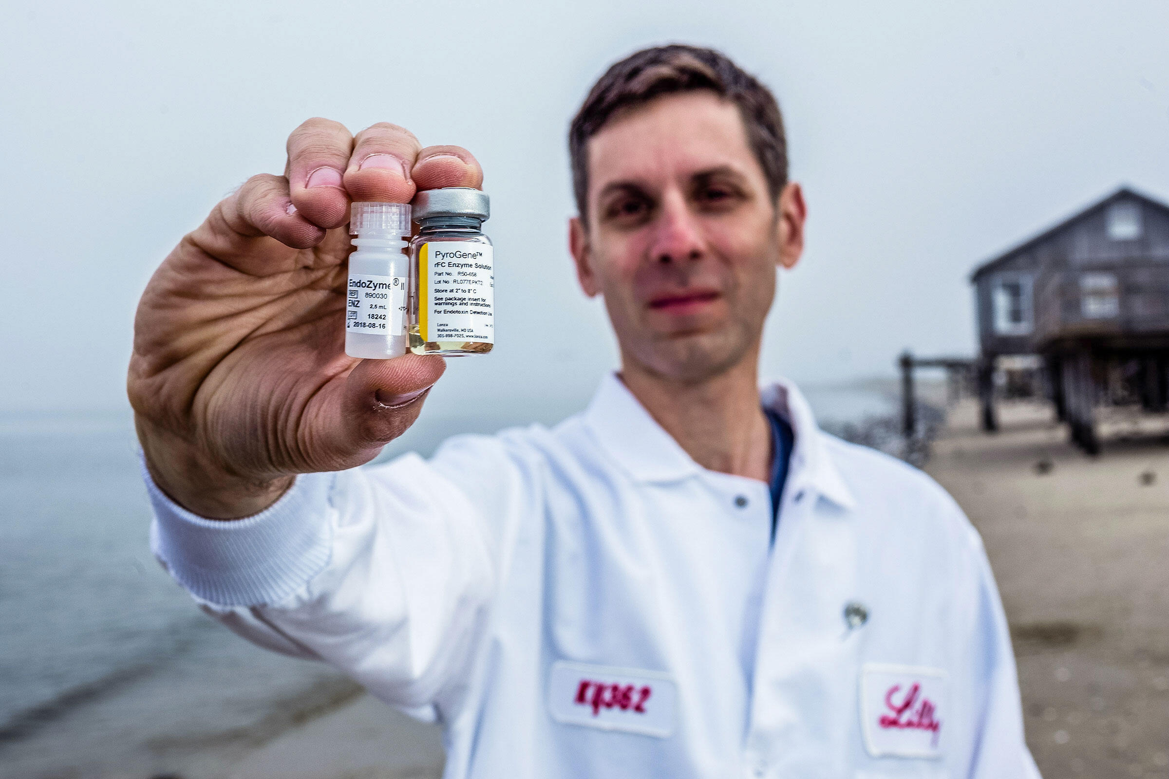 Entrada: Jay Bolden, un científico alto y delgado que parece desaparecer en su bata de laboratorio. Trabaja en un laboratorio nuevo y resplandeciente que se encuentra en el centro de desarrollo tecnológico de Eli Lilly en Indianápolis. Durante los últimos cinco años, en su laboratorio lejos del mar, ha estado trabajando continuamente para desarrollar un producto que permita que la presión de la biomedicina deje de recaer en los cangrejos herradura. A partir de investigaciones realizadas en Singapur, y continuadas en Maryland, ha estado recopilando evidencia de que una enzima sintética, el factor C recombinante (que suele abreviarse como rFC, por su nombre en inglés) puede reemplazar a la sangre de cangrejo herradura en pruebas de endotoxinas. De acuerdo a su trabajo, el rFC permite obtener los mismos resultados que el LAL, es más eficaz y rentable, y no requiere utilizar animales vivos. “Beneficiará a Eli Lilly”, afirma.
