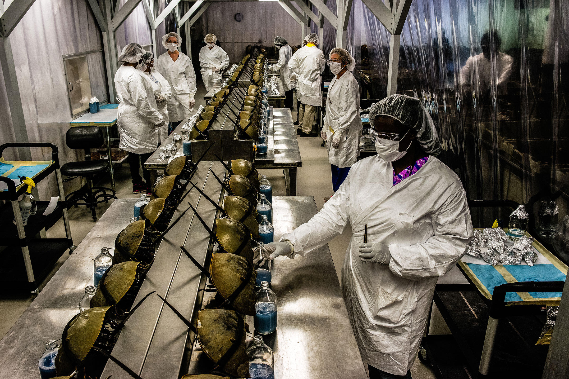 ¿Qué ha sucedido? A principios de la década del '90, los pescadores tomaban hasta dos millones de cangrejos herradura al año para utilizarlos como carnada en trampas para congrios y buccinos. Al mismo tiempo, las empresas biomédicas atrapaban a los animales para proteger la salud pública. La sangre azul de los cangrejos herradura es el ingrediente clave necesario para las pruebas más importantes que detectan la presencia de endotoxinas, una contaminación bacteriana que puede existir en fármacos y dispositivos médicos y generar peligro de muerte. Según la industria, cada año se realizan aproximadamente 70 millones de pruebas de endotoxinas. Las empresas que realizan las pruebas, conocidas como LAL, o lisado de amebocito de limulus, debido al Limulus polyphemus o cangrejo herradura, extraen la sangre de los cangrejos herradura y luego los devuelven al agua. Los investigadores académicos y los científicos de la industria difieren en cuanto a la cantidad de cangrejos que fallecen durante el proceso: la cantidad estimada es de entre el cinco y el treinta por ciento. Además, la pérdida de sangre genera consecuencias a largo plazo, tales como la pérdida de estado físico y un mayor nivel de susceptibilidad frente a infecciones, lo cual también puede contribuir a la reducción de la población.
