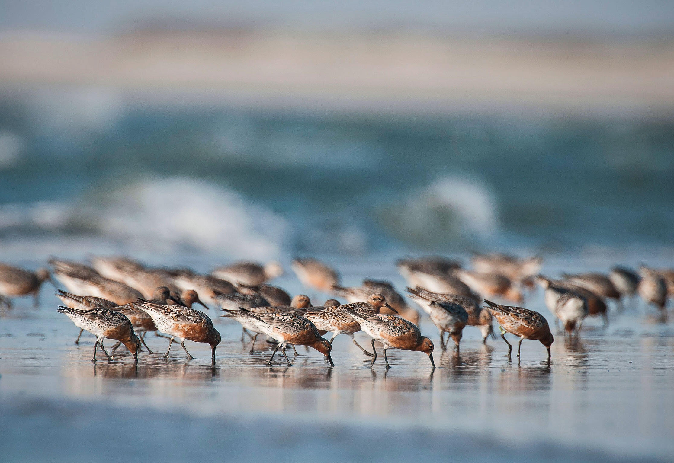 El ave en cuestión es el Correlimos Gordo de la especie rufa, una de las seis subespecies de Correlimos Gordo del mundo. Es un ave playera de pecho rojizo cuyo tamaño es similar al de un zorzal petirrojo. Migra entre Tierra del Fuego, donde invernan la mayoría de las aves, y el Ártico canadiense, donde se reproducen. En cada tramo de esta ruta migratoria recorre 9,000 millas. Al viajar hacia el norte, ruta en la que las bandadas de correlimos a veces vuelan durante días sin detenerse, hacen una pausa en la Bahía de Delaware, un verdadero Serengeti de aves playeras durante la migración de primavera. El lugar también es el hogar de la concentración de cangrejos herradura más grande que queda en el mundo al día de hoy. En mayo y junio, cuando las mareas se encuentran lo más altas posible, los cangrejos herradura, uno de los animales más antiguos del planeta, emergen desde las aguas profundas para poner sus huevos en la arena. Los correlimos, exhaustos y famélicos luego de su viaje hacia el norte, se detienen para recargar las baterías. Para ello, se alimentan de huevos de cangrejo pequeños y llenos de grasa, que les permiten generar una reserva de energía suficiente como para completar su largo viaje hasta el Ártico.