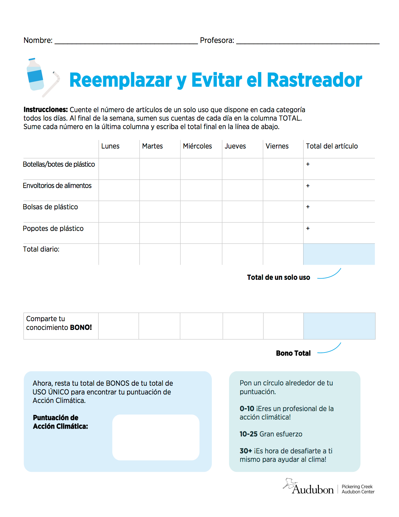 ¿Cuánto plástico puedes eliminar de tu vida? Descúbrelo con el Reto de Reemplazar y Evitar. Utiliza la hoja de trabajo del Rastreador de Reemplazo y Evasión. Imprime el PDF o, si no tienes impresora, copia el diseño y dibuja tu propio gráfico en una hoja de papel. Durante una semana entera, anote cuántos artículos de plástico se utilizan en su hogar. También puedes contar las toallas de papel y las latas, ya que el proceso de creación de esos artículos también libera contaminación de carbono. Una vez que sepas cuánto estás usando, puedes encontrar maneras de reducir tu uso de plástico para ayudar a las aves y ayudar a prevenir el cambio climático.