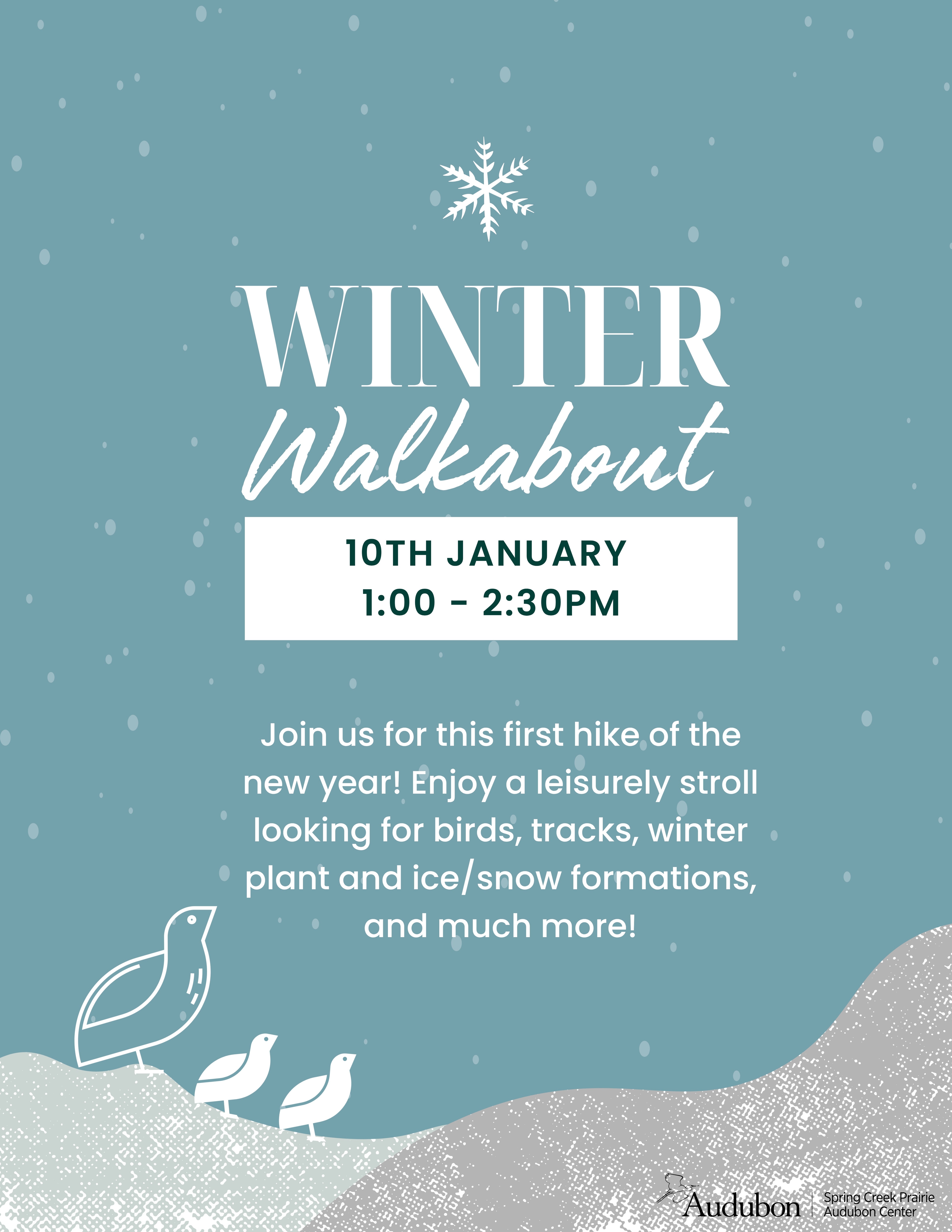 Join us for this leisurely stroll through the winter tallgrass looking for animal tracks and chat about what birds & beasts do to survive the winter...
