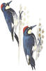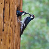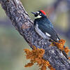 Members of group harvest acorns in fall, store them in hole-studded trees, feed on them in following seasons. Insects are gleaned from surface of tree, or caught in swooping, acrobatic flight. Unlike most woodpeckers, rarely or never excavates in wood for insects. May feed on sap, digging pits in bark or visiting those made by sapsuckers.