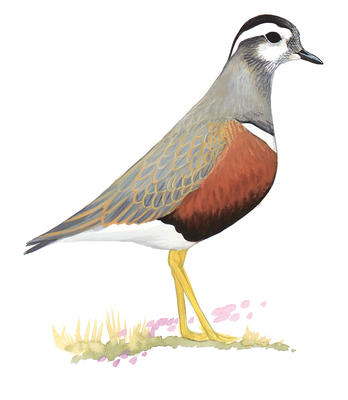 Males perform flight display over breeding territory by flying high, with exaggerated slow, deep wingbeats, while repeatedly giving a short kt-dlink call. In courtship, male walks up to female in crouching posture with tail raised, neck stretched forward. Nest site is on ground on very open, dry tundra. Nest (probably built by male) is shallow depression in tundra, lined with lichens, moss, grass, leaves.