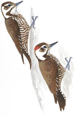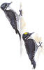 Forages on live or dead conifers, especially spruces. Often scales off flakes of bark to get at insects, and may gradually remove all bark from a dead tree. Members of a pair forage together at times, but usually separately while nesting.