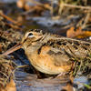 Feeds mostly by probing with bill in soft soil. Tip of bill is sensitive and flexible, allowing bird to detect and then grab creatures in the soil. Sometimes performs odd rocking motion while standing; possibly the vibration from this will disturb earthworms into moving; it has been suggested that the woodcock can hear sounds of creatures moving underground.