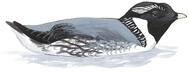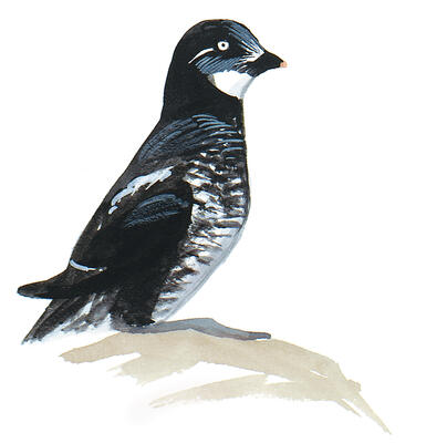 Elegantly marked, a diving bird of the northern Pacific Coast. More agile in flight than most auks, able to take off directly from water, flocks often banking and turning in unison. Breeding behavior unusual for a seabird: Males 'sing' at night from tree branches and other high perches at nesting colonies; the species regularly raises two young (most auks raise only one); it raises its young at sea, leading them away from the nest within a few days after they hatch. The name 'Ancient' results from gray back, with fancied resemblance to a shawl draped across an old person's shoulders.
