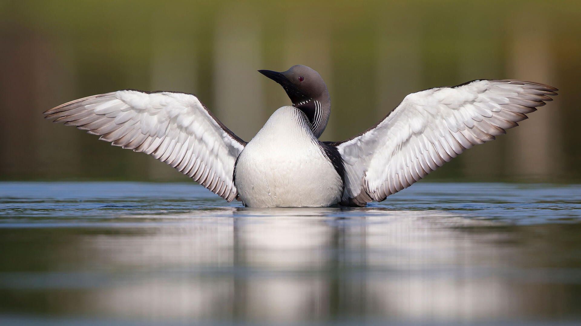 Loons do their foraging by diving from the surface and swimming underwater. They often swim along the surface with their heads partly submerged, peering about underwater, watching for prey before they dive. They are propelled mainly by their feet, but may sometimes use their wings also when turning or in bursts of speed. Loons find their food by sight.