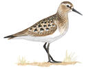 Rainpools, mudflats, shores, fields. In migration, often chooses slightly drier or more open habitats than related small sandpipers: dry and sandy shores, nearby grassy areas, even open fields. Also found on mudflats, flooded fields. Breeds on dry upland tundra in Arctic.
