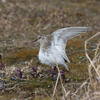 Male flies high over breeding habitat in slow hovering flight, fluttering wings continuously, giving trilled song. At beginning of breeding season, males may tend to be clustered fairly close together, perhaps to help in attracting females to area. Nest site is on ground on dry tundra, in area with rocks and only low ground cover. May be well hidden under grass clump. Nest (probably built mostly by male) is a shallow scrape, lined with lichens, grass, dry leaves.