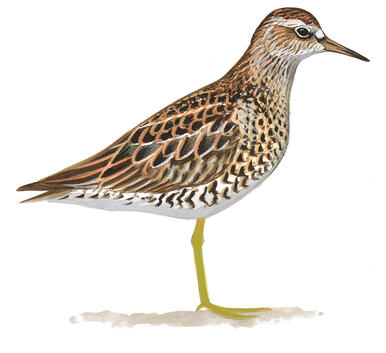 Nesting in the high Arctic, the Baird's Sandpiper is seen by birders mostly in its migrations through the Great Plains. Many other shorebirds that migrate north through the prairies in spring go south off our Atlantic Coast in fall; however, the Baird's Sandpiper follows the plains route at both seasons, although a few spread out to either coast in fall. A long-winged, long-distance migrant, this is one of the few shorebirds that regularly stops at lakes in the high mountains.