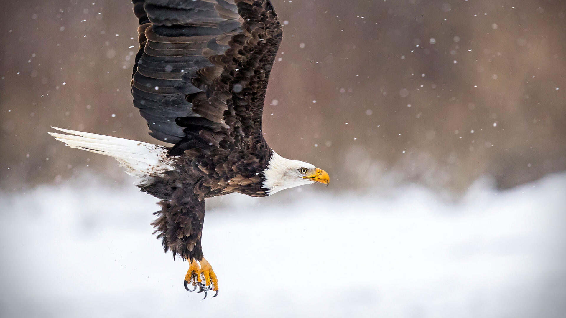 Often next to water along coasts, rivers, or large lakes; in forested areas with access to openings and/or edges for foraging. The Bald Eagle inhabits anywhere prey is abundant including swamps in Florida, conifer forest edges in southeastern Alaska, treeless islands in Aleutians, and desert rivers in Arizona. In winter, can be found in very dry, open western valleys with access to open water.